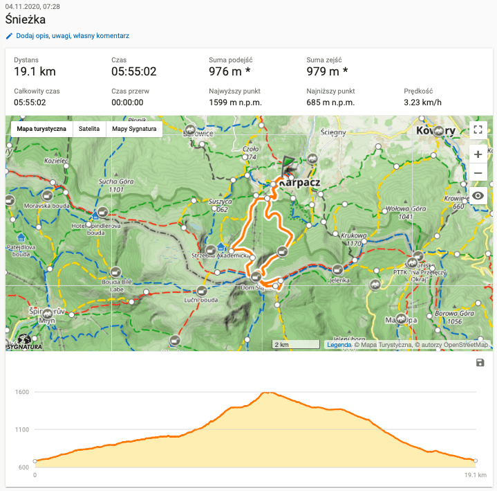 Nasza trasa to pętla rozpoczynająca się bezpośrednio ze Szklarskiej Poręby (okolice pola namiotowego). Podążaliśmy szlakami: niebieskim, następnie czarnym do łącznika ze szlakiem czerwonym (Głównym Szlakiem Sudeckim), który doprowadził nas pod szczyt. Powrót na pole namiotowe zrealizowaliśmy szlakiem niebieskim. Całość wyprawy to solidny, całodniowy marsz, który nie jest ekstremalnie stromy, ale wymaga dobrej kondycji ze względu na dystans.