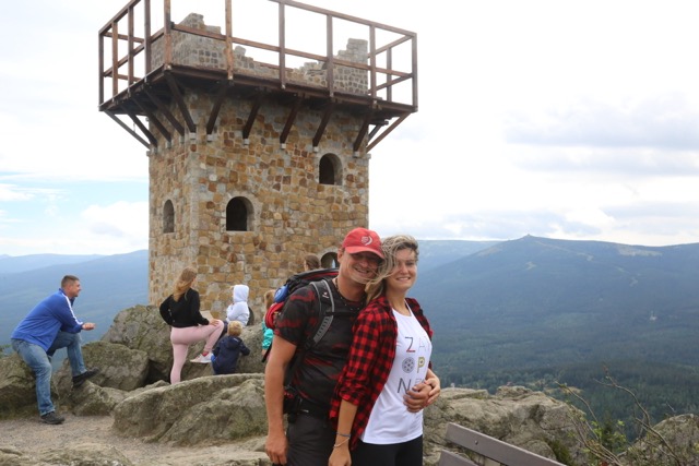 Pierwszy szczyt zdobyty w ramach KGP. Tak to właśnie tutaj zaczyna się nasza przygoda. Jak mówi stare chińskie przysłowie, że każdy nawet ten wielki marsz zaczyna się zawsze od pierwszego, małego kroku. To był właśnie ten nasz pierwszy, mały krok. Nasz początek z górami, a przede wszystkim sprawdzenie nas zarówno jako pary ale i zespołu podczas często ciężkich wyzwań jakimi jest zaplanowanie, zorganizowanie i przejście trasy osiągając zaplanowany szczyt. Myślę, że dla nas obojga było to duże wyzwanie, jednak nasze pozytywne nastawienie i wspólny cel, nie tylko nas nie poróżnił ale i zmotywował a przede wszystkim również wzmocnił. Ten szczyt to był początek nie tylko KGP ale jak się później okazało również innych dużo większych wyzwań jak DGP i innych koron ale także GSŚ czy GSB. Noclegi podczas tej wyprawy zaplanowaliśmy pod namiotem na urokliwym polu namiotowym pod nazwą „Nad Rozkosznym Stawem” w Szklarskiej Porębie. Po drodze do Szklarskiej wskakujemy jeszcze do Decathlonu w Jeleniej Górze aby Sylwia mogła doposażyć się w buty trekkingowe odpowiednie do górskich wypraw. Do tej pory nie potrzebowała a więc i nie miała. Namiot rozbijamy już po ciemku, ale wybieramy miejsce pod dwoma świerkami w bezpośrednim sąsiedztwie stawu. Rano po rozsunięciu namiotu dopiero doceniamy naszą bajeczną lokalizację, w cieniu z widokiem na staw. Śniadanko i kawkę zajadamy w turystycznych warunkach przy namiocie, co daje nam przedsmak czekającej przygody. Na szczyt postanawiamy ruszyć bezpośrednio z naszego pola bez podjeżdżania samochodem. Dlatego ruszamy najpierw szlakiem niebieskim a następnie szlakiem czarnym dochodzimy do szlaku czerwonego, którym docieramy pod szczyt. Pierwszym naszym przystankiem jest schronisko na Wysokim Kamieniu, które robi na nas duże wrażanie, nasz podziw rośnie kiedy dowiadujemy się, że zostało zbudowane z własnych środków przez właściciela, który poświęcił pół swojego życia na jego budowę. Klimat zyskał dodatkowo w momencie gdy jakaś zorganizowana grupa zaczęła śpiewać chórkiem, co prawda jakieś kościelne pieśni ale brzmiało to niesamowicie. Dalej trasa nie jest już tak wymagająca i stroma. Idziemy nadal czerwonym szlakiem po malowniczej trasie i z bajecznymi widokami. Mijamy po drodze Kopalnię Kwarcu Stanisław, która swoimi rozmiarami robi na nas duże wrażenie. Dalej po drodze łapie nas mały przelotny deszczyk a więc jest okazja do założenia kurtek przeciwdeszczowych. Końcówka wejścia na szczyt wymaga zejścia ze szlaku ale droga jest dobrze oznaczona i przyjemna. Na szczycie, który jest rozległą polaną robimy sobie oczywiście pamiątkowe zdjęcie, wbijamy w książeczkę stempelek i biwakujemy przygotowując posiłek z lifiozy podgrzany na kuchence gazowej. Wysiłek uwieńczamy dodatkowo układem tanecznym – bachata. Powrót w atmosferze zwycięstwa mija nam szybko i miło, jednak wybieramy inną trasę i wracamy szlakiem niebieskim na nasze pole namiotowe, gdzie wieczorem biesiadujemy w ogólnodostępnej świetlicy, przy grzańcu i planach na zdobywanie kolejnych szczytów.