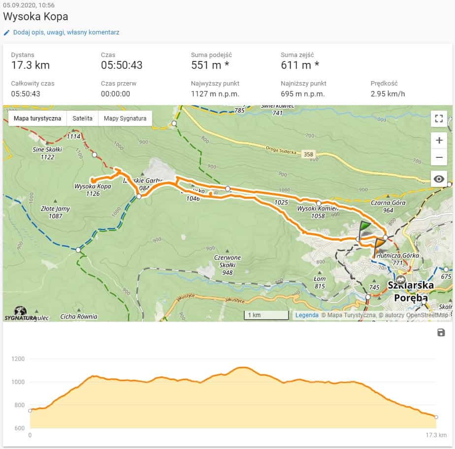 Nasza trasa to pętla rozpoczynająca się bezpośrednio ze Szklarskiej Poręby (okolice pola namiotowego). Podążaliśmy szlakami: niebieskim, następnie czarnym do łącznika ze szlakiem czerwonym (Głównym Szlakiem Sudeckim), który doprowadził nas pod szczyt. Powrót na pole namiotowe zrealizowaliśmy szlakiem niebieskim. Całość wyprawy to solidny, całodniowy marsz, który nie jest ekstremalnie stromy, ale wymaga dobrej kondycji ze względu na dystans.