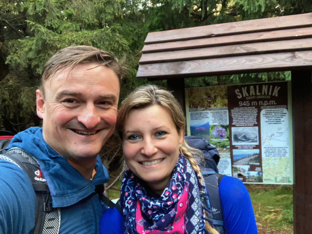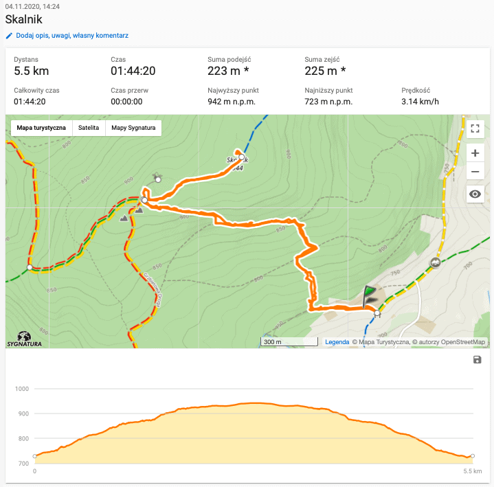 Nazwa szczytu ewidentnie kojarzy nam się z jednym ze sklepów, w którym chętnie robimy zakupy, głównie przed kolejnymi wyprawami. Warunki na szlaku wyśmienicie złociście jesienne. Samochód zostawiamy na poboczu drogi i ruszamy niebieskim szlakiem w stronę szczytu Skalnika. Początkowo szlak wiedzie przez piękny las ale dość stromym podejściem. Po dojściu Pod Ostrą Małą, gdzie szlaki czerwony, niebieski, zielony, żółty łączą się i rozgałęziają robi się płasko i pojawiają się okazałe skałki, które robią na nas bardzo duże wrażenie. Dalsza podróż odbywa się „Grzbietową Drogą” po „płaskim” aby w pewnym momencie zejść ze szlaku i drogą dojść do szczytu Skalnika. Na szczycie teren ładnie zagospodarowany z tablicami informacyjnymi. Robimy pamiątkowe zdjęcia aby uwiecznić nasze dokonanie oraz przybijamy pieczątkę w naszych książeczkach i spełnić warunek zdobywcy KGP. Droga powrotna mija nam równie przyjemnie i po drodze zachwycamy się ciekawym zjawiskiem przebijającego się światła promieni słonecznych przez lekką mgiełkę dodatkowo rozproszonych przez drzewa. Widok mistyczny i również warty upamiętnienia na zdjęciach.