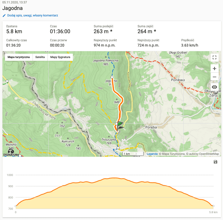 Podczas zdobywania Jagodnej, pogoda odzwierciedlała złotą polską jesień. Pomimo, że był to początek listopada nie było zimno a słoneczko nieśmiało przedzierało się przez chmury. Jednak napięty grafik ostatnich dni dawał już bardzo mocno o sobie znać i zmęczenie nieubłaganie odciskało swoje piętno. Dlatego, kiedy na szczycie naszym oczom ukazała się piękna wieża widokowa to nie mieliśmy nawet siły pomyśleć o wejściu na nią i postanowiliśmy skorzystać z widoków rozpościerających się z niej przy kolejnym wejściu.